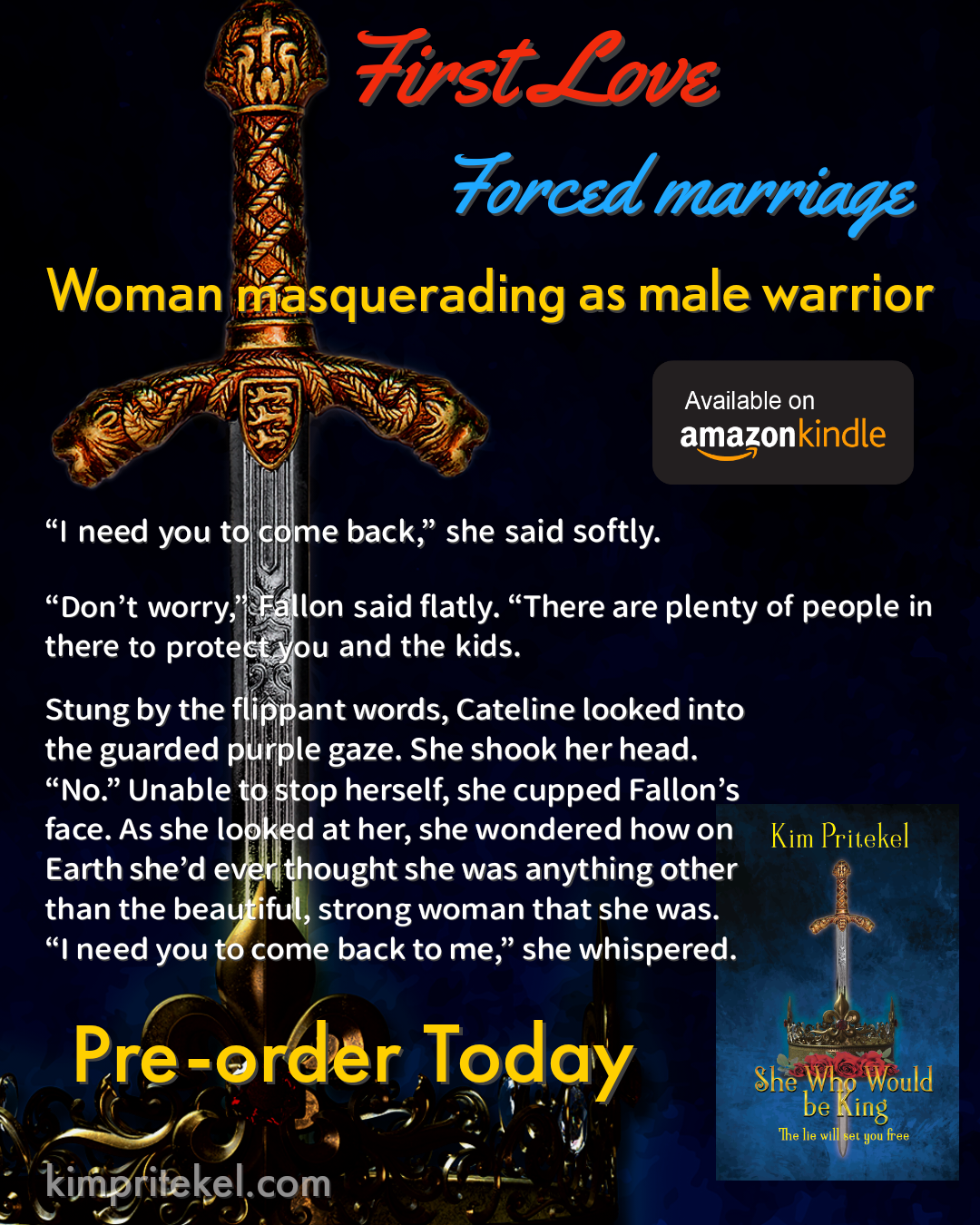 All rights reserved. No part of any of the publications on this site may be reproduced, transmitted in any form or by any means, electronic or mechanical, including photocopy, recording, or any information storage and retrieval system, without permission in writing from Kim Pritekel. The characters herein are fictional and any resemblence to a real person, living or dead, is purely coincidental. Any resemblance of actual events, locales, or organizations is entirely coincidental and beyond the intent of the author.