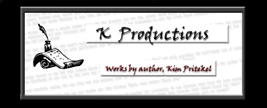 Welcome to K Productions! Welcome to K Productions! This is the official website for Kim Pritekel's eBook novels, novellas, short stories and web series. Here you can purchase Kim's work in eBook format and get it sent directly to your inbox where it can be downloaded to your computer or reading device and enjoyed anywhere you go! Come back often to see what's being added to the store, as Kim will be updating often, or join the K Productions Yahoo! Group and get updates about new stories and products.